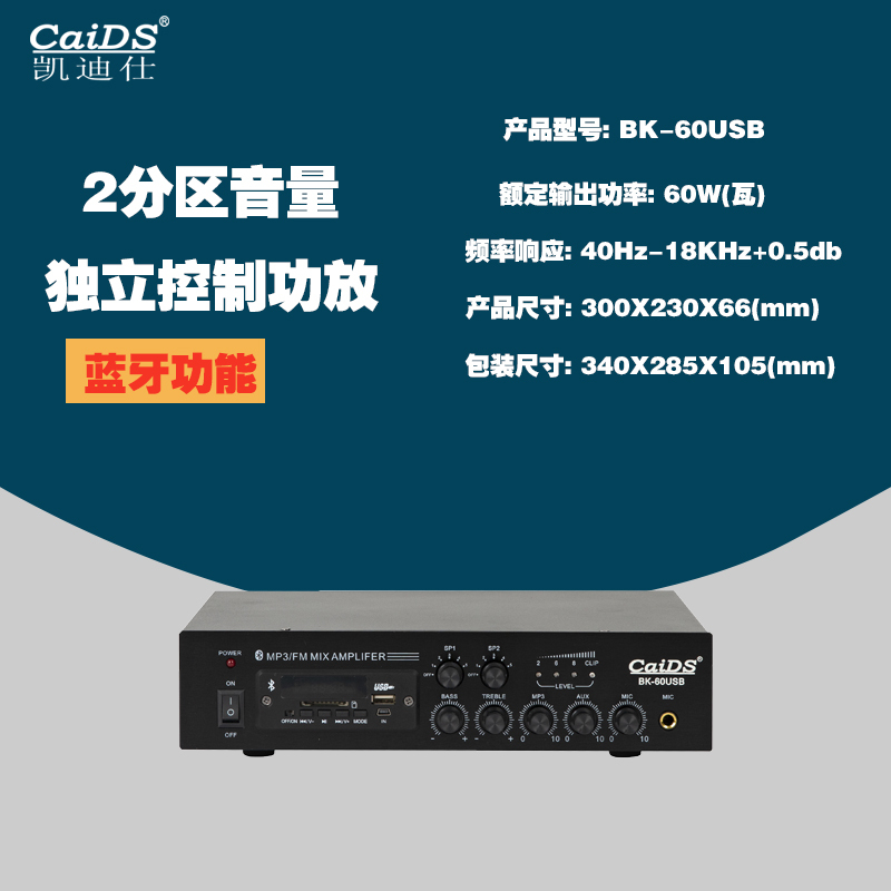 1路麦克风输入、2 路线路输入、1 路线路输入、 路线路输出麦克风、AUX、MP3、高低音均可独立调节可插U盘播放,麦克风有默音优先功能上曲、下曲、暂停/播放、循环、EQ模式控制输出4-16欧姆110V(定压分区音量独立控制)带可靠的短路过载保护装置,确保机器工作性能稳定可播放U盘/SD卡和FM收音/蓝功能,带遥控铝合金拉丝面板,黑色和银色两种机型可选择
